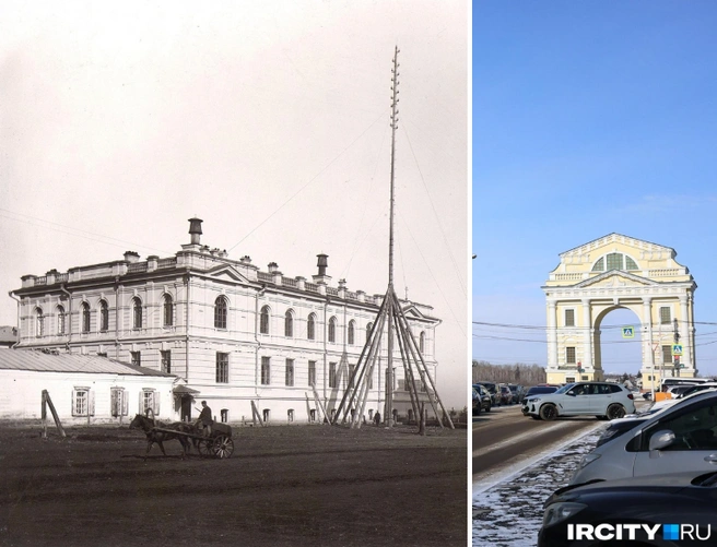 Совсем рядом с улицей Польских Повстанцев расположен собор Богоявления. 100 лет назад он выглядел иначе — на фото нет шатровой колокольни, которая была разрушена в XVIII веке и восстановлена в 1960-х. На фоне — утраченная Царская триумфальная арка, вместо которой теперь стоит памятник Основателям Иркутска