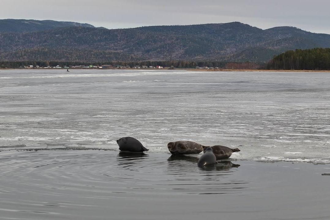 Даже рыбаков не боятся. Четыре нерпы устроили лежбище у поселка на берегу БайкалаОни вышли на первый лед